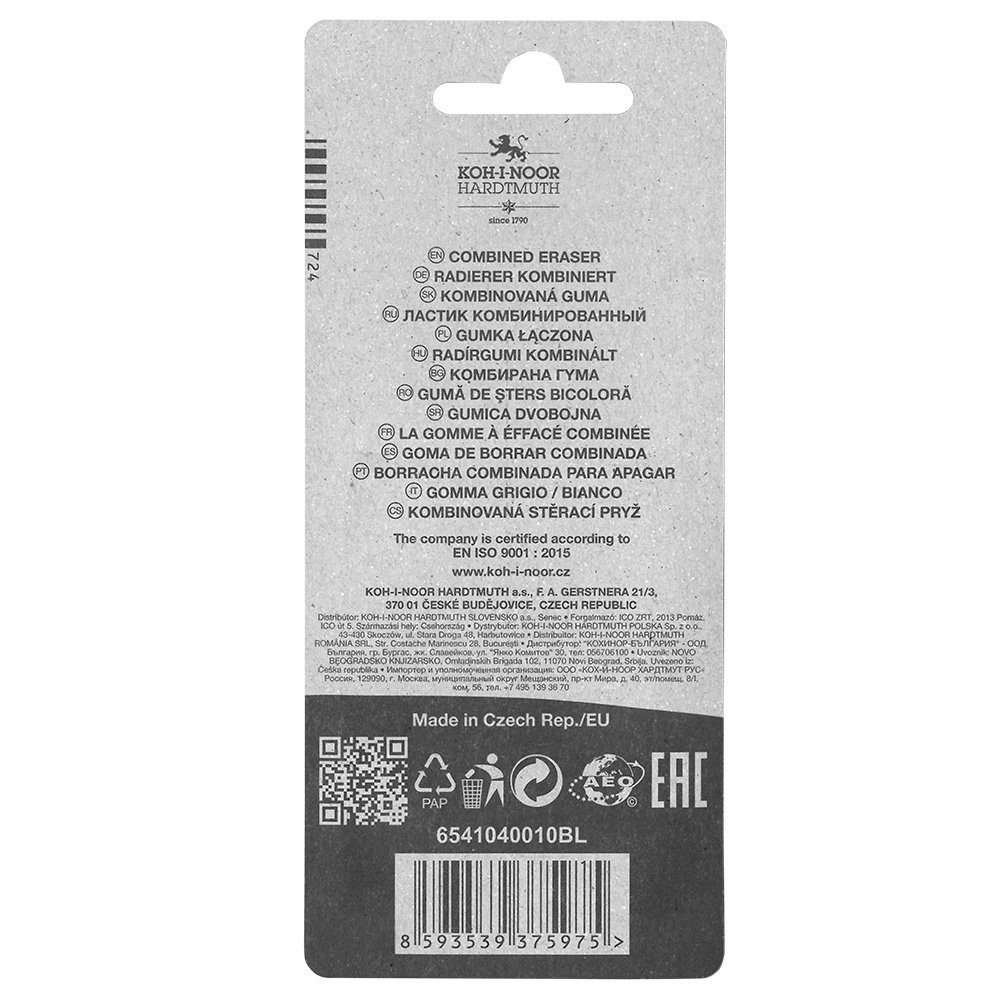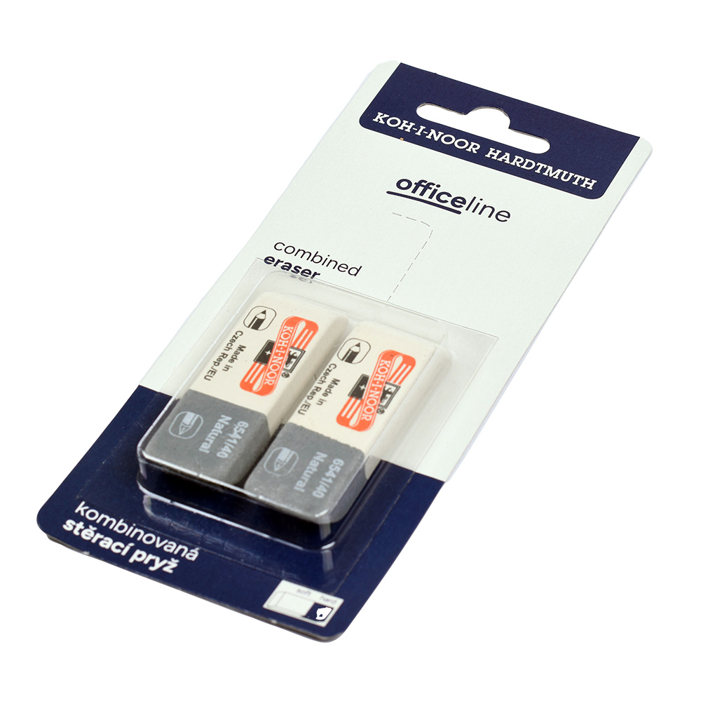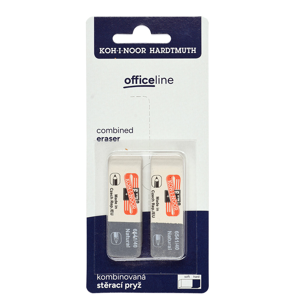 Office natural-based eraser without addition of plastic materials and phthalates. Soft part (red) is designed for erasing of graphite lines of medium classes of hardness. Hard part (blue) is designed for erasing of ink lines and stains, Indian ink, typewriting machine letters, and removing leads.