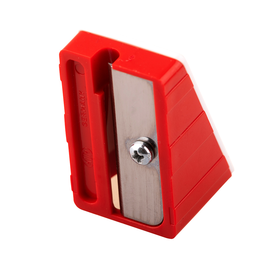 The product is used for schools and offices. Plastic sharpener, market, for thick pens. Width = 26 mm. Length = 42 mm. One side depth = 24 mm. Second side depth = 8 mm.