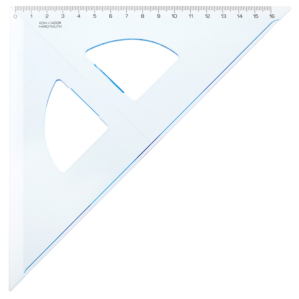 Set square 45/177 with a vertical made from blue transparent polystyrene. Hot stamping technology is used to imprint the scale. Scales accuracy 0,2% of length. A line for drawing of verticals is created on the set square in addition to the measurement scale. The set square is designed for drawing and technical drafting in schools and office. Packed in printed polyethylene bag with EURO hanger.