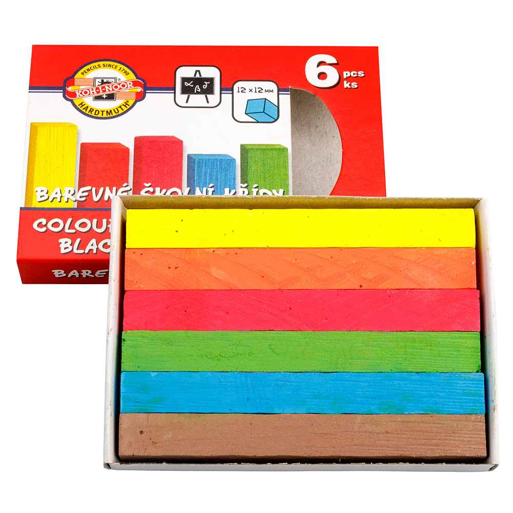 Set of 6 pieces of square coloured blackboard chalk 12 x 12 x 100 mm, designed for writing on a blackboard, inserted in a box with a printed sleeve.