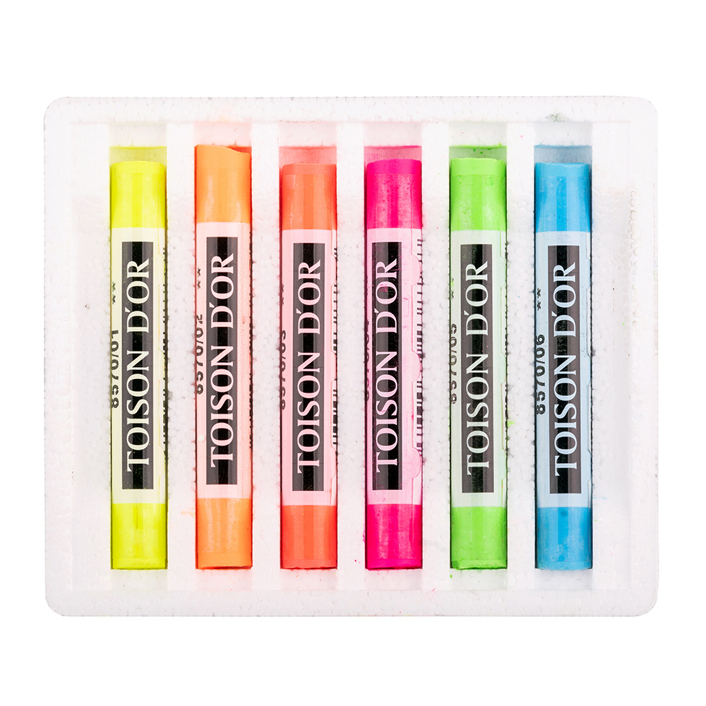 Set of powdery fluorescent pastels, diameter of 10 mm and length of 75 mm. Pastels have distinctive bright luminous mark. They can be used for highlighting and brightening the artwork. They are also suitable for advertising use.