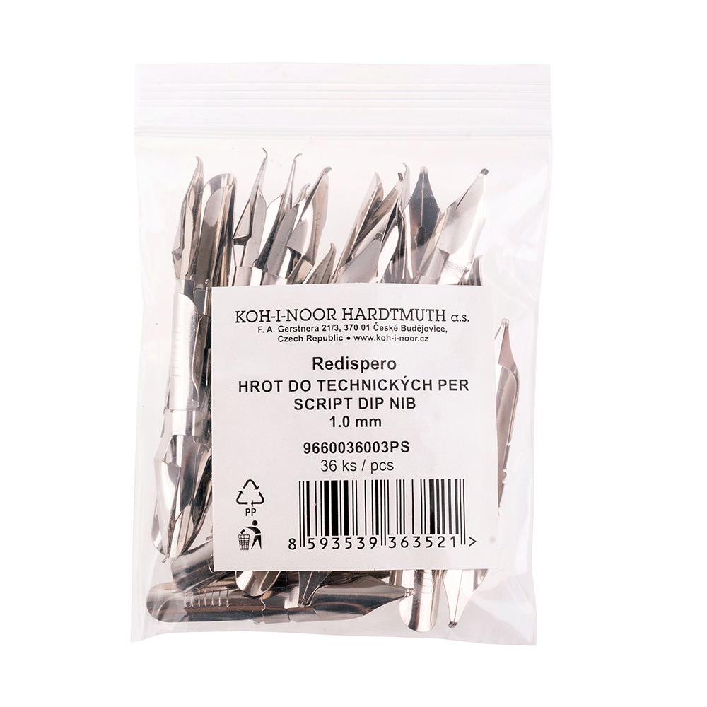 Set of 36 nibs in closable OPP bag. 36 pieces of nibs for technical pens with width of 1,0 mm inserted into closable OPP bag.