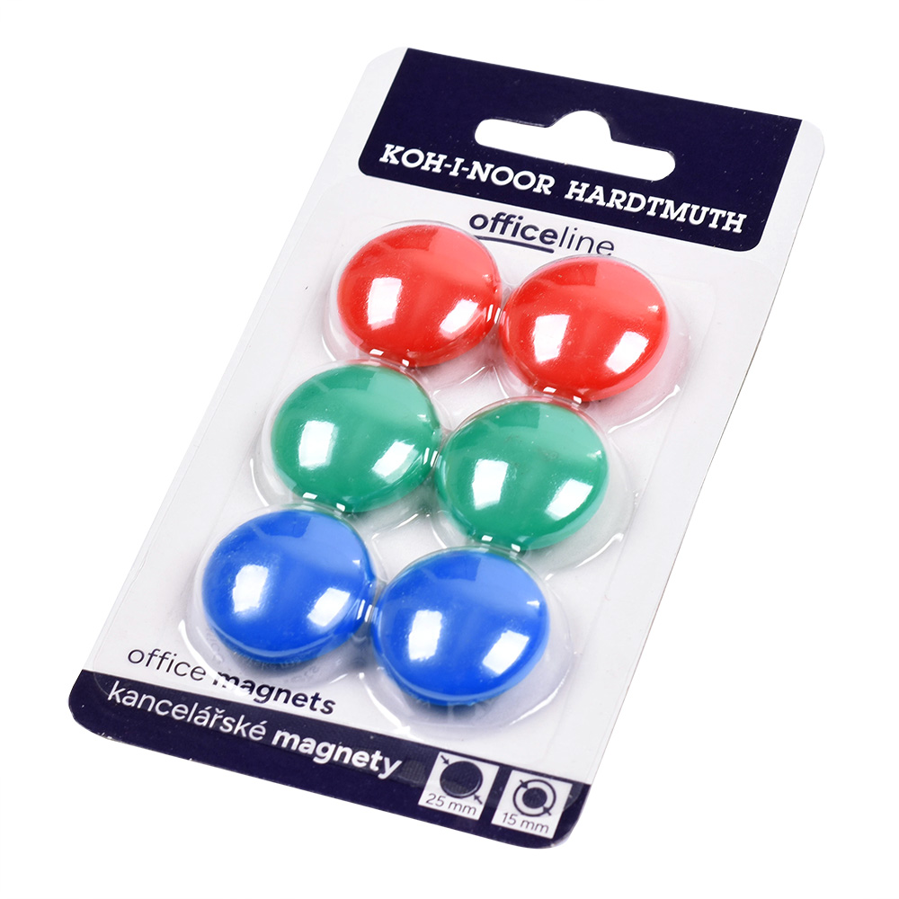 Round 20 mm magnet, magnet diameter 20 mm, height 7 mm. Plastic magnet with a magnetic surface on the bottom. Mixture of colours. 6 magnets packed in a blister. The magnets are used to fix e.g. paper onto a magnetic board.