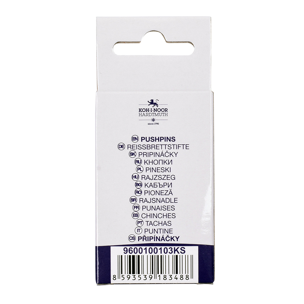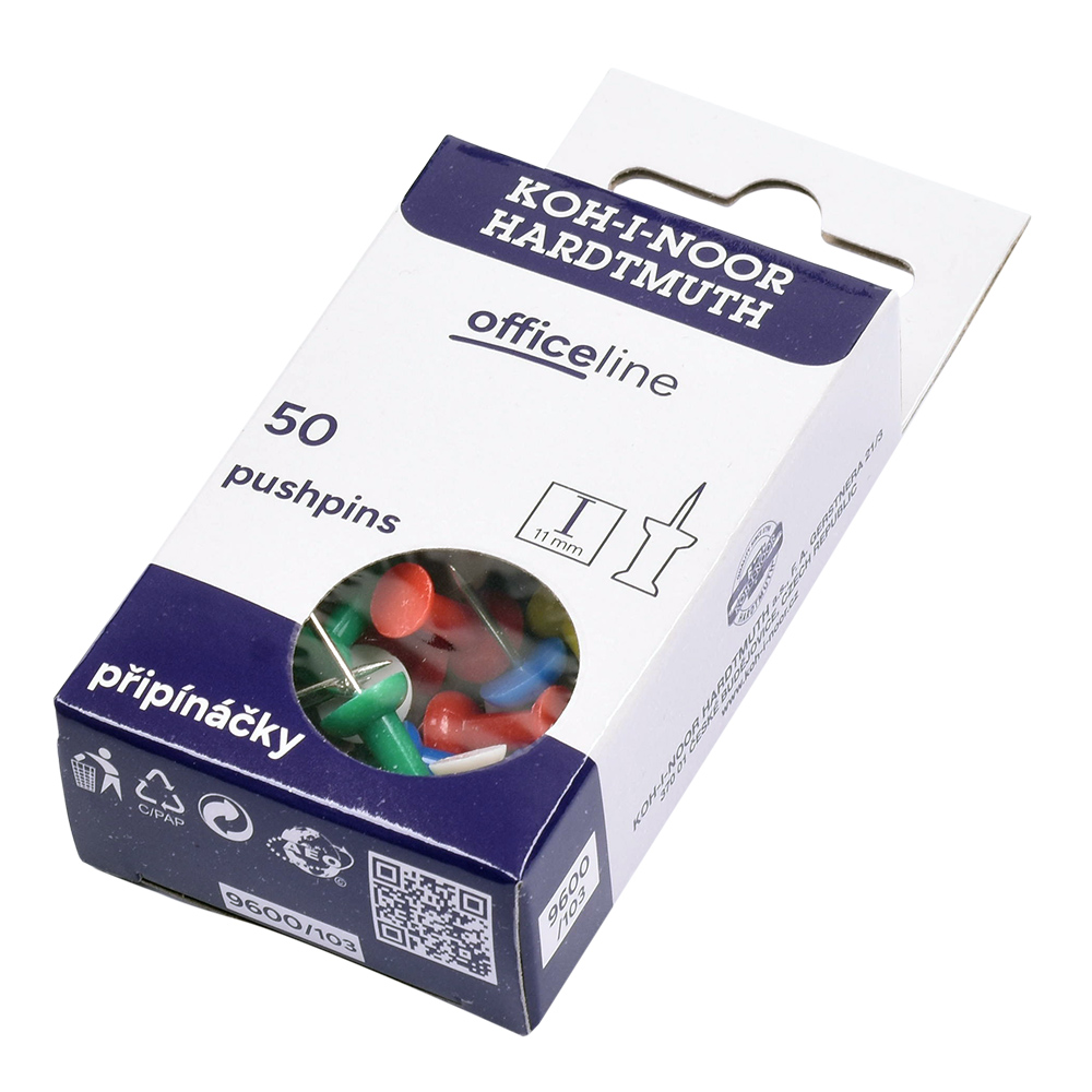 Drawing pin with plastic holder, 23 mm high, diameter 10 mm in the widest part, plastic holder – mixture of colours, metal tip, 50 pcs in the cardboard box. Used to fix papers or things made e.g. from fabric and other light materials to a cork board.