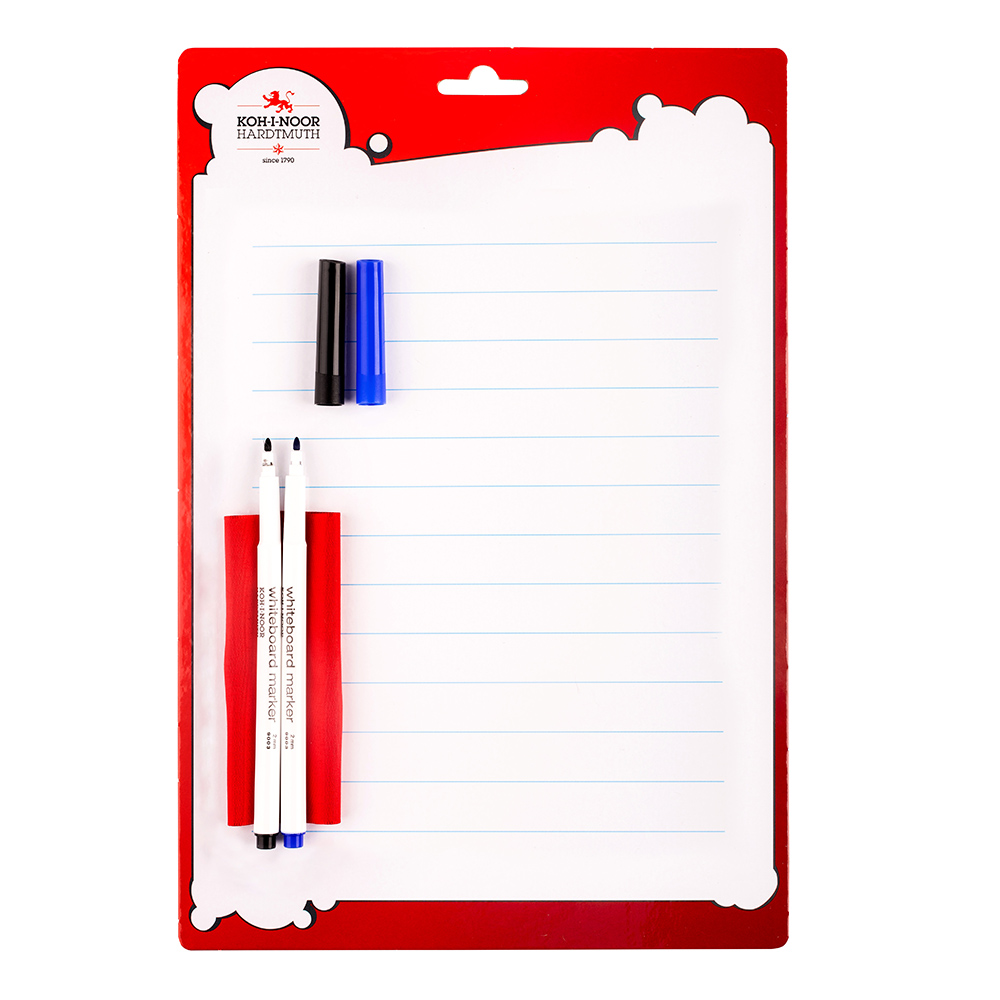 The product contains a two-sided white board table of A4 format and two markers filled with dry wipe ink. One side of the table has rows and is intended for writing practice, the other side is without printing and is intended for painting. The font can be wiped off with the supplied fabric.