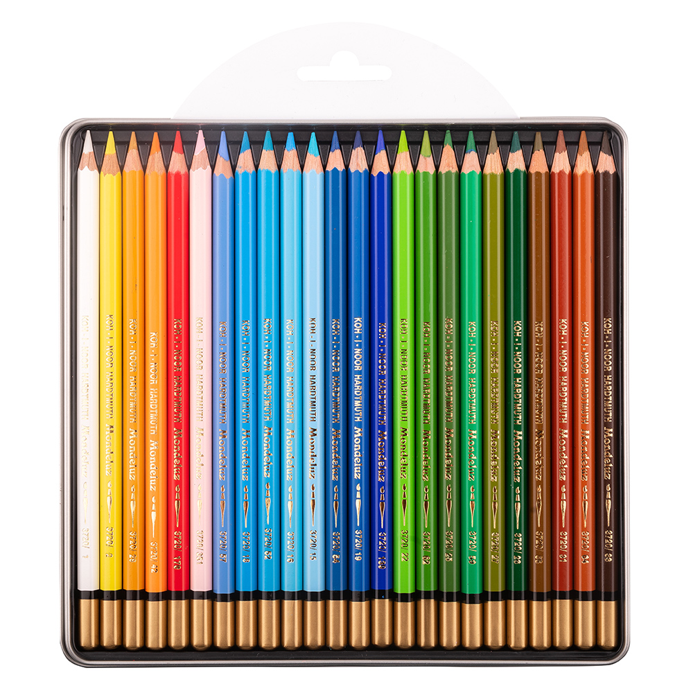 Set of 24 WATERCOLOUR coloured pencils - LANDSCAPE - in a metal case. Coloured pencils are hexagonal OK - 7 mm, with high quality, strongly pigmented lead with a diameter of 3,8 mm. Pencils have excellent surface finish, lacquered ending and gold labelling. They are characterized by rich mark and can be further modified with water by using a brush or sponge. Suitable for artistic and hobby drawing.
