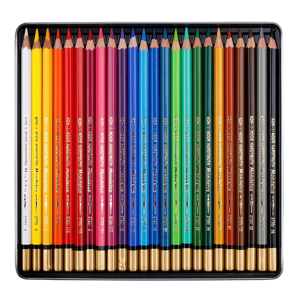 Set of 24 WATERCOLOUR coloured pencils in a metal case. Coloured pencils are hexagonal OK - 7 mm, with high quality, strongly pigmented lead with a diameter of 3,8 mm. Pencils have excellent surface finish, lacquered ending and gold labelling. They are characterized by rich mark and can be further modified with water by using a brush or sponge. Suitable for artistic and hobby drawing.