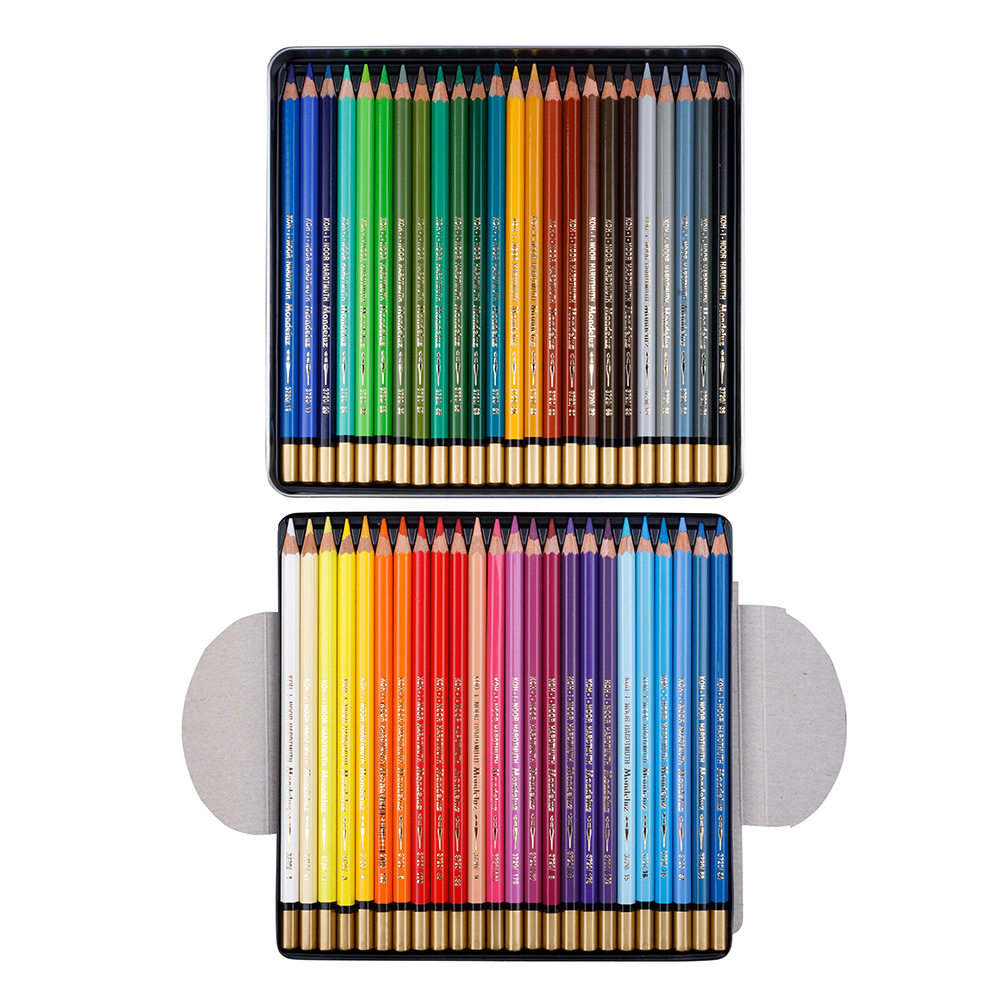 Set of 48 WATERCOLOUR coloured pencils in a metal case. Coloured pencils are hexagonal OK - 7 mm, with high quality, strongly pigmented lead with a diameter of 3,8 mm. Pencils have excellent surface finish, lacquered ending and gold labelling. They are characterized by rich mark and can be further modified with water by using a brush or sponge. Suitable for artistic and hobby drawing.