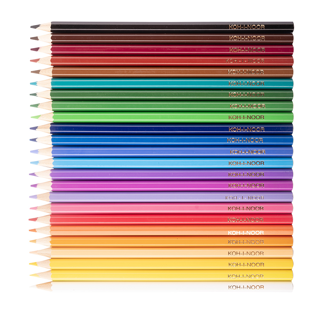 A set of hexagonal coloured pencils. The pencils have a wooden casing and are packed in sets of 24 shades in a cardboard box. The pencils will leave an intense trace and are suitable for both school and universal use.