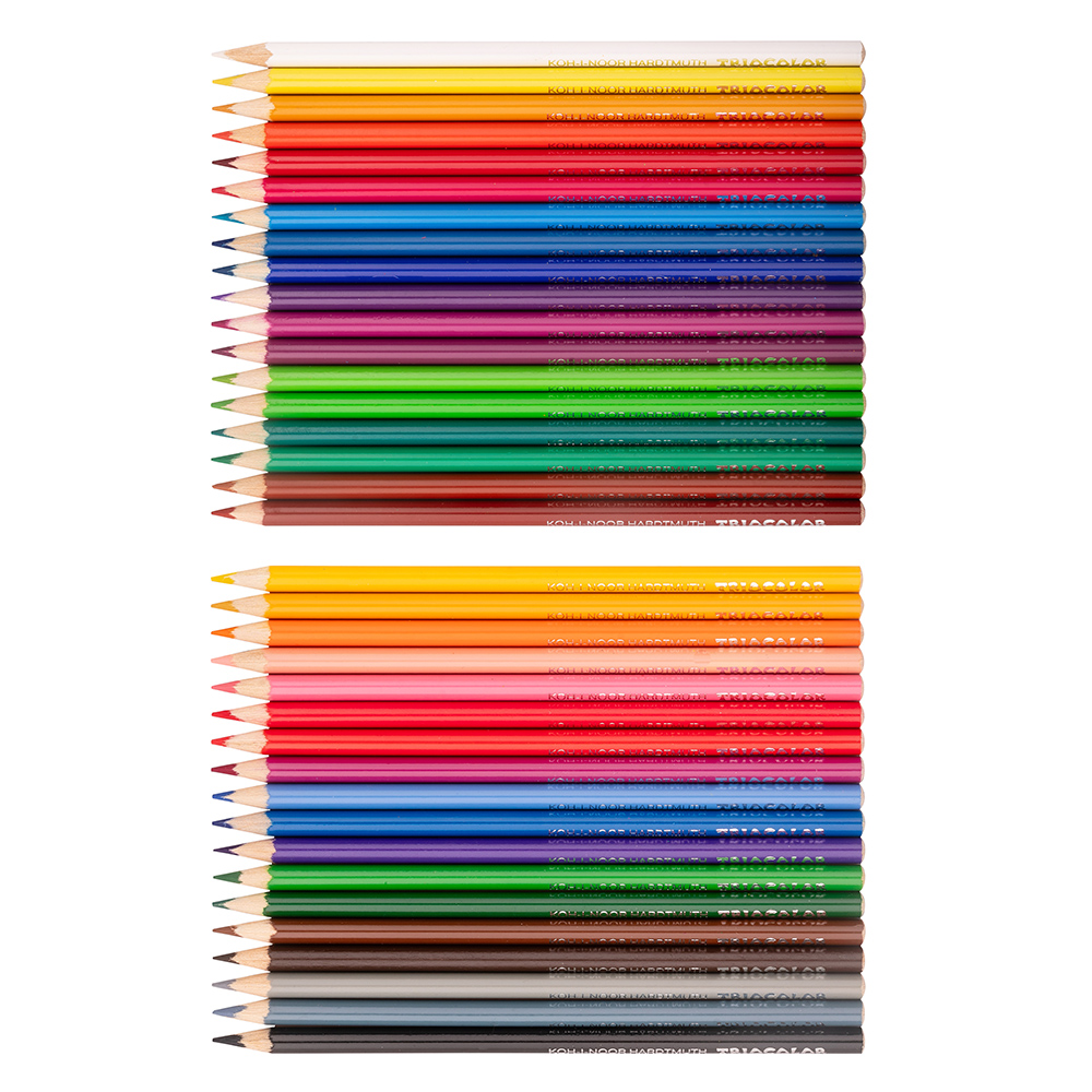 Triangular coloured pencils in a wooden casing. 36 colours are packed in a cardboard box. The ergonomic triangular shape allows for optimum grip and guiding the pencil. These pencils are designed for creative and professional use.