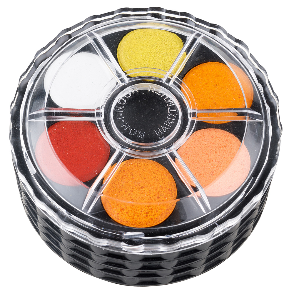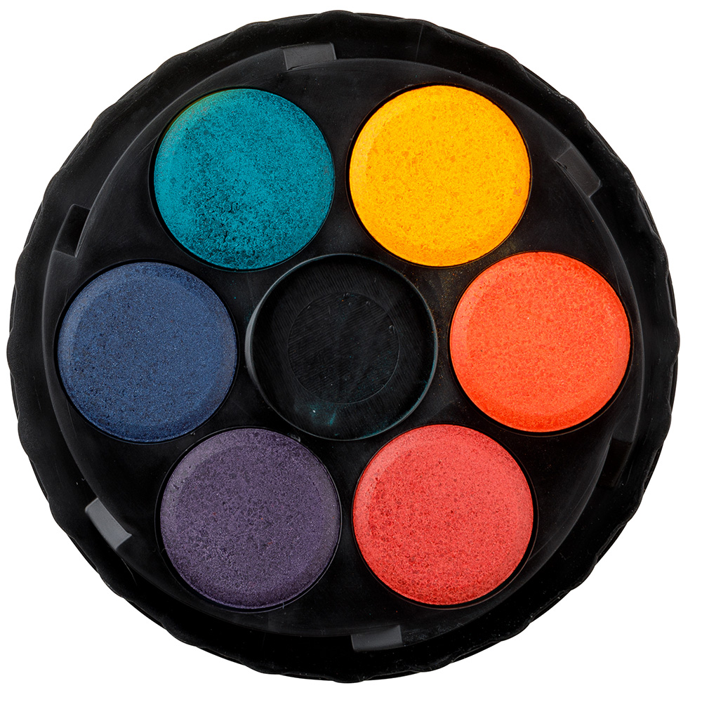 Vodové barvy o průměru tablet 22,5 mm s 36 brilantními odstíny vhodné pro speciální výtvarné techniky, např. pro kolorování fotografií, malby portrétů, malby na dekorační předměty, zdobení kraslic aj. Vložené v plastovém barevníku s transparentním víčkem.