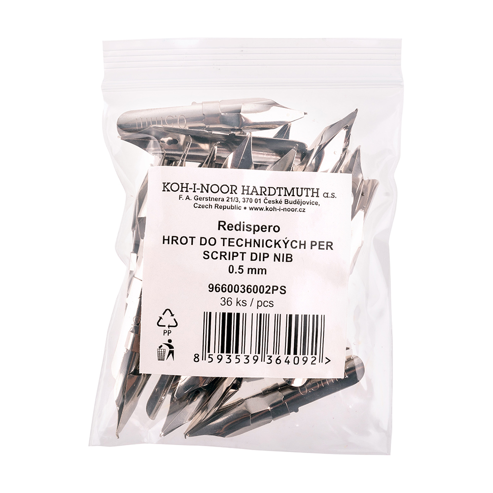 Sada 36 hrotů v uzavíratelném OPP sáčku. 36 kusů hrotů do technických per o rozměru hrotu 0,5 mm vloženo do uzavíratelného OPP sáčku.