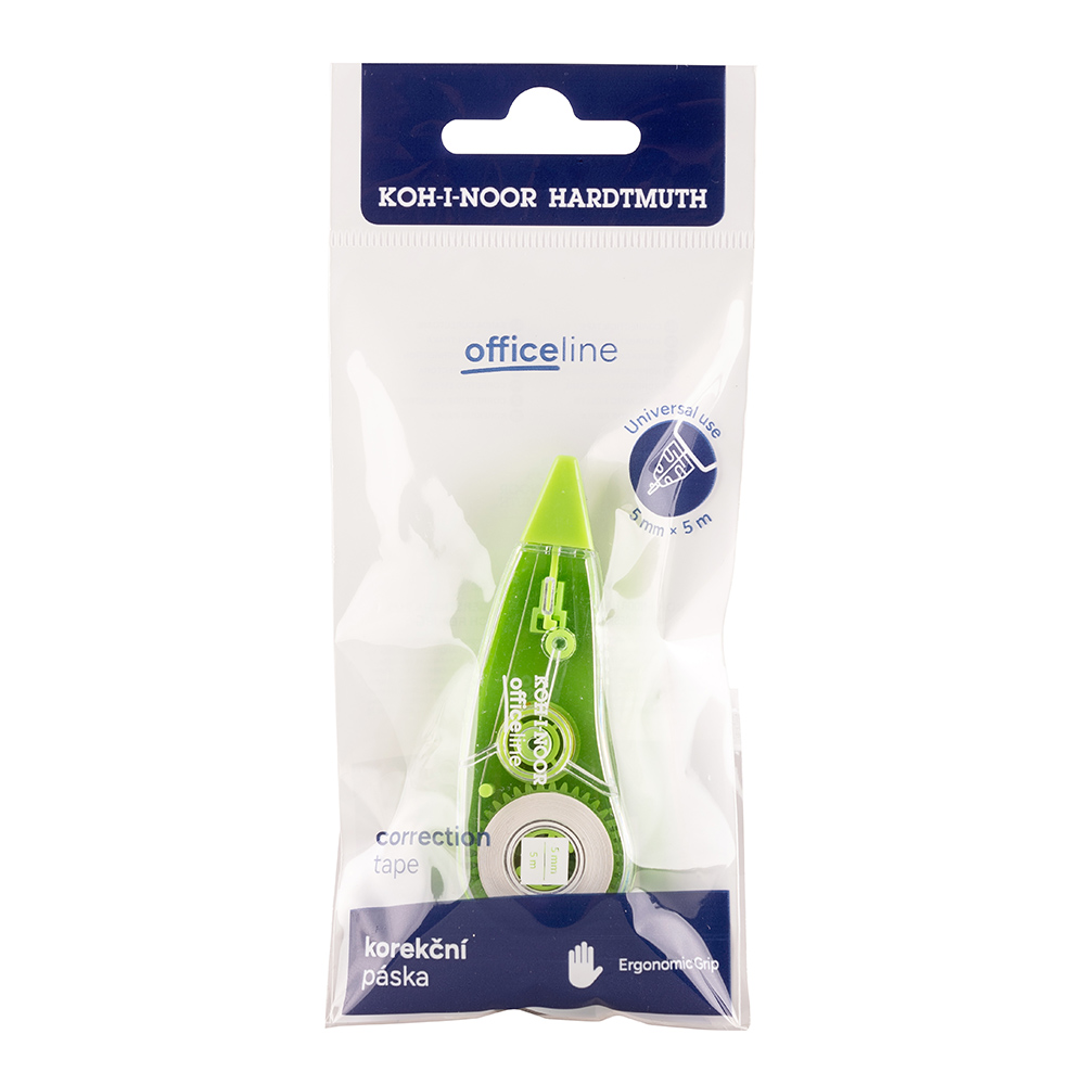 Korekční strojek je složen z plastového těla (dávkovače) a PET pásky pokryté z jedné strany tenkou vrstvou bílé směsi, která se po nanesení na papír od pásky oddělí a překryje plochu na kterou je aplikována. Zabělená plocha je ihned přepisovatelná. Zadní strana strojku je barevná, neprůhledná a je dodávána v assortu tří barev - modré, žluté a zelené. Přední strana strojku je transparentní s bílým potiskem. Aplikátor pásky na konci strojku je opatřen plastovým ochranným uzávěrem, který je ve stejné barvě jako zadní stěna strojku. Délka opravné pásky je 5 m a její šířka 5 mm. Korekční strojek je zabalen do potištěného OPP sáčku s eurozávěsem
