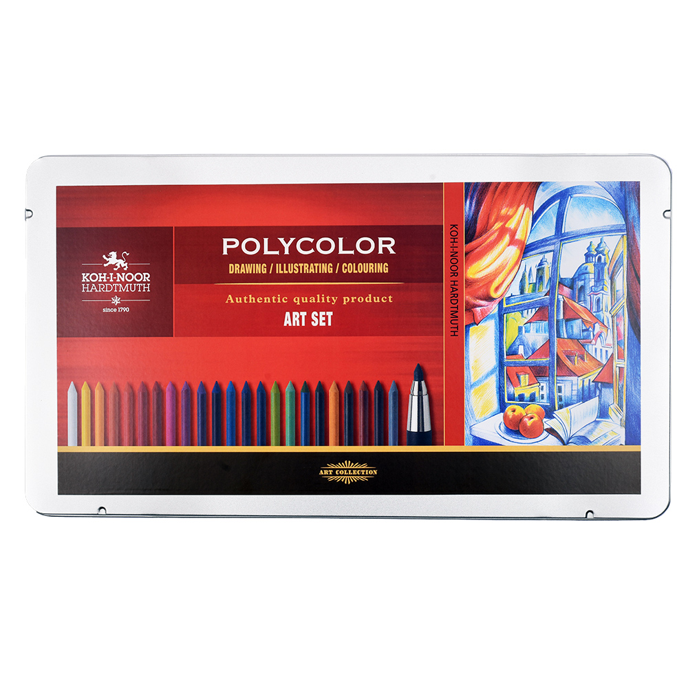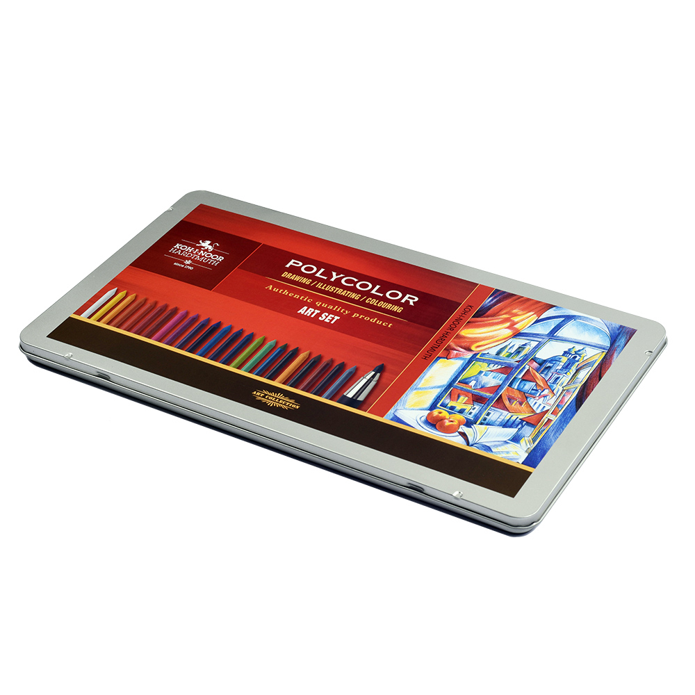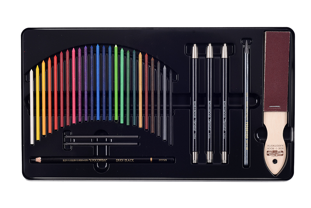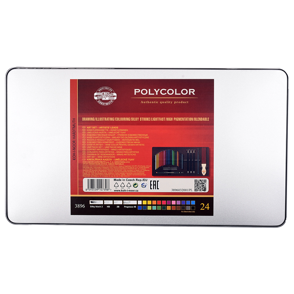 SOUPRAVA KRESLÍŘSKÁ 3896 – v plechovém obalu, obsahující: 24x -pastel. tuhy nerozmyvatelné 4240; 2x - grafit.tuhy113/HB, 2B; 1x – umělecká tužka NEGRO 8815/2; 3x - mech. tužka 5356; - Progresso 8911/4B; 1x- brousítko). Je vhodná pro umělce i pro hobby kreslení.