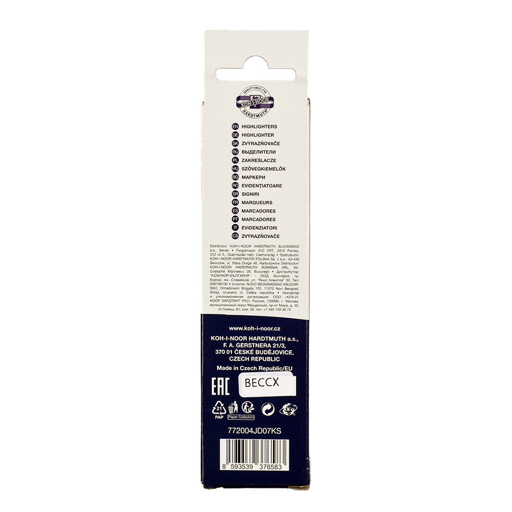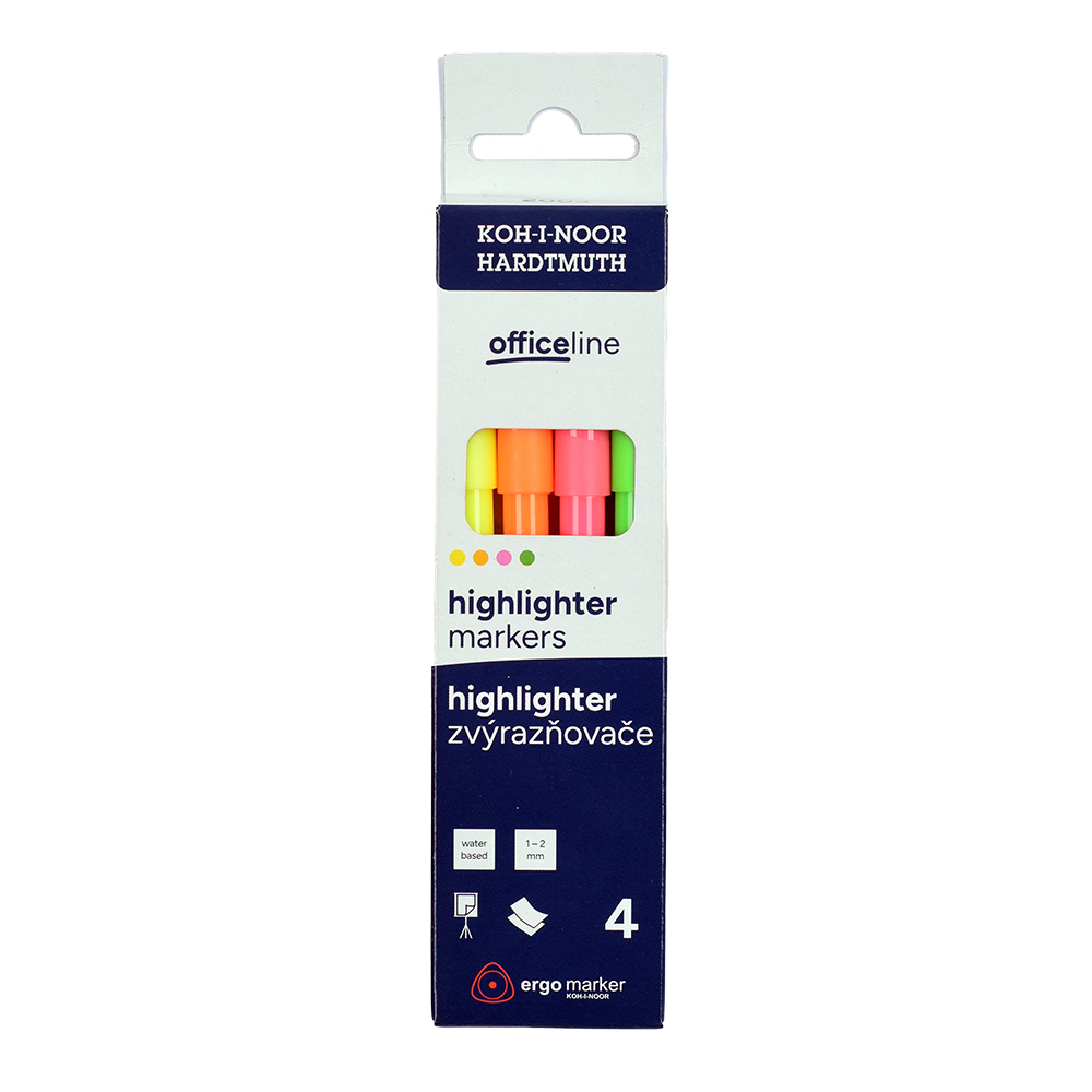 Zvýrazňovače jsou plněny pestrými pigmentovými inkousty ve 4 odstínech a vyrobeny z materiálů zajišťujících odolnost proti vyschnutí minimálně po dobu 3 let. Jsou určeny ke zvýrazňování textů na všech druzích papíru. Klínové hroty jsou odolné proti zatlačení, šířka stopy je 1–2 mm, délka stopy až 200 m. Zvýrazňovače jsou navržené s důrazem na maximální bezpečnost – speciální chránítko umožňuje dýchání i v případě spolknutí. Jsou balené v papírových krabičkách.