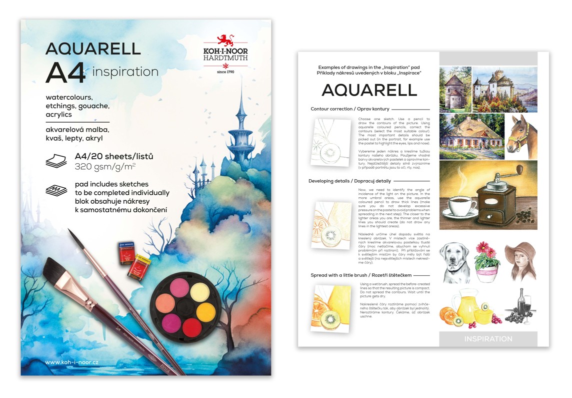 Lepený blok s předtištěnými motivy pro akvarelovou malbu, lepty, kvaš a akryl. Obsahuje 20 listů ve formátu A4 s gramáží papíru 320 g/m2. Zadní část obálky je z kartonu. Zadní strana dále obsahuje příklady, jak lze předtištěné motivy kolorovat. Lepení bloku je pouze v hlavě. Rozměr 297 x 210 x 11 mm.