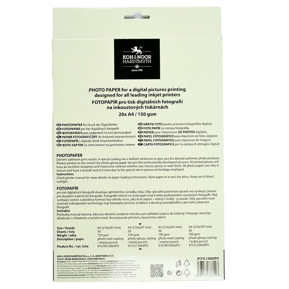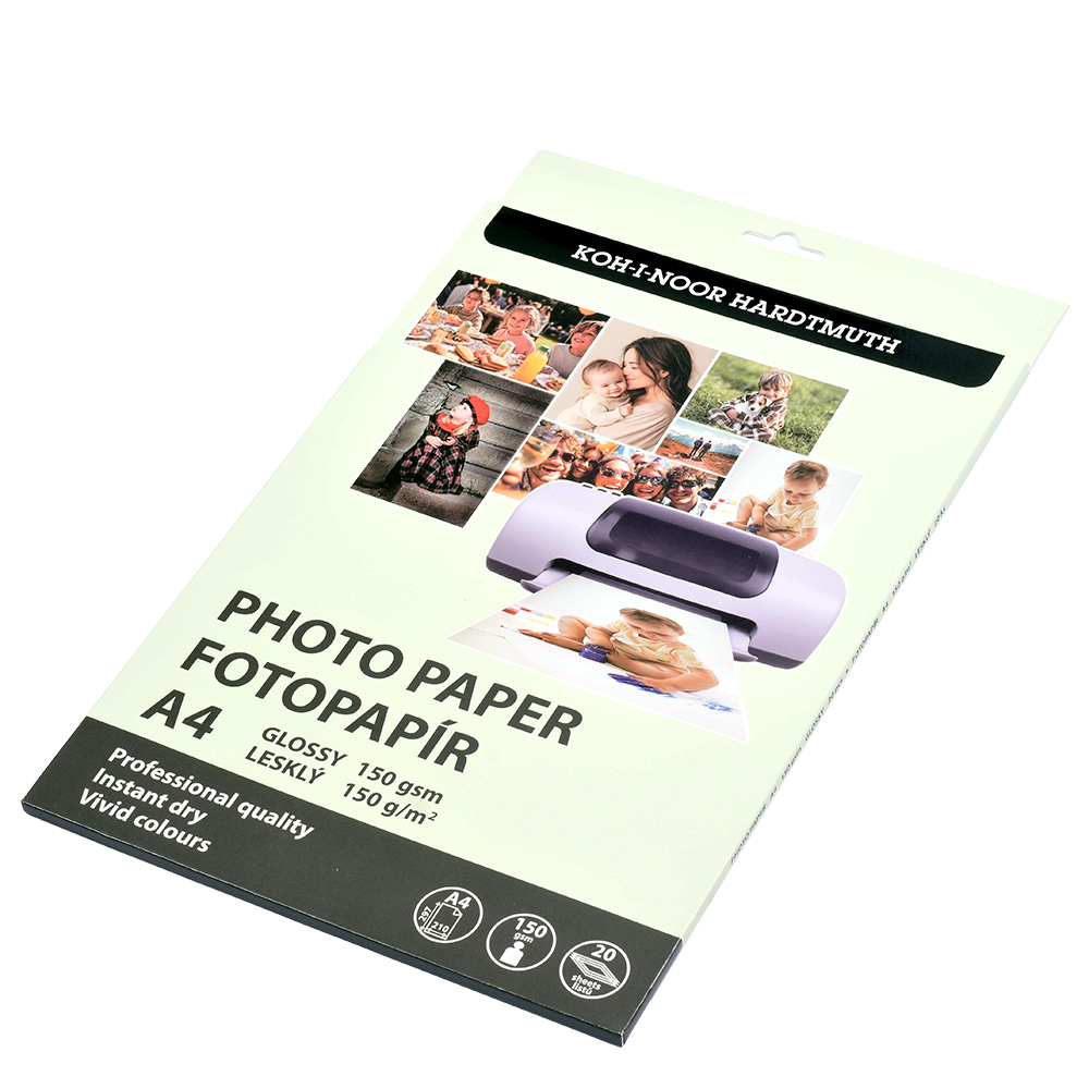 Papír pro tisk digitálních fotografií, použití pro barevné inkoustové tiskárny. Matný papír gramáž 150 gsm, formát A4 - 210 x 297 mm. 20 listů v obálce.
