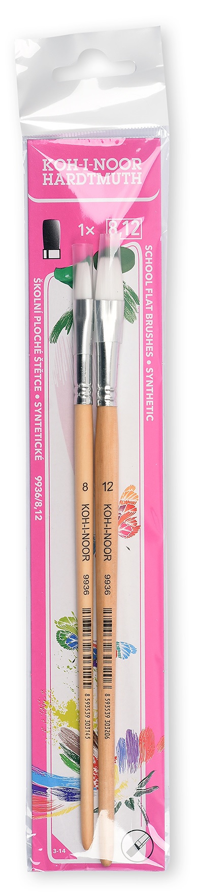 Plochý štětec syntetický je určený pro školní účely. Je to sada 2 ks plochých štětců. Velikost štětce je č. 8 a 12. Mají přírodní lakovaný dřík, syntetický bílý vlas a toulec z hliníku. Vlas je dlouhý 14 a 16 mm, šířka vlasu je 8,8 a 11,8 mm a rukojeť je dlouhá 165 a 175 mm. Vlas je lepený. Štětce jsou uloženy v plastovém sáčku s eurozávěsem, vlasem směrem k eurozávěsu. Uvnitř je potištěná papírová vložka. Rozměr soupravy s eurozávěsem 320 x 55 x 10 mm.
