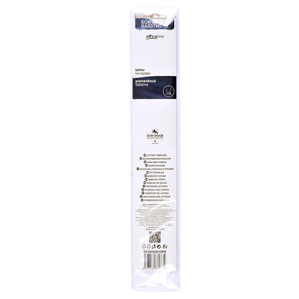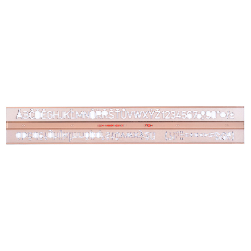 Písmenková šablona vyrobená z kouřového průhledného polystyrenu. Je určena pro práci s technickým perem 1,0 mm. Obsahuje znaky velké a malé abecedy, číslic a matematických znaků. Veškeré znaky jsou velikosti 10 mm a tvaru kolmého písma dle ČSN. Šablona je určena k popisování ve škole i v kanceláři. Zabalena je do celotransparentního polypropylenového pouzdra s papírovou vložkou a eurozávěsem.