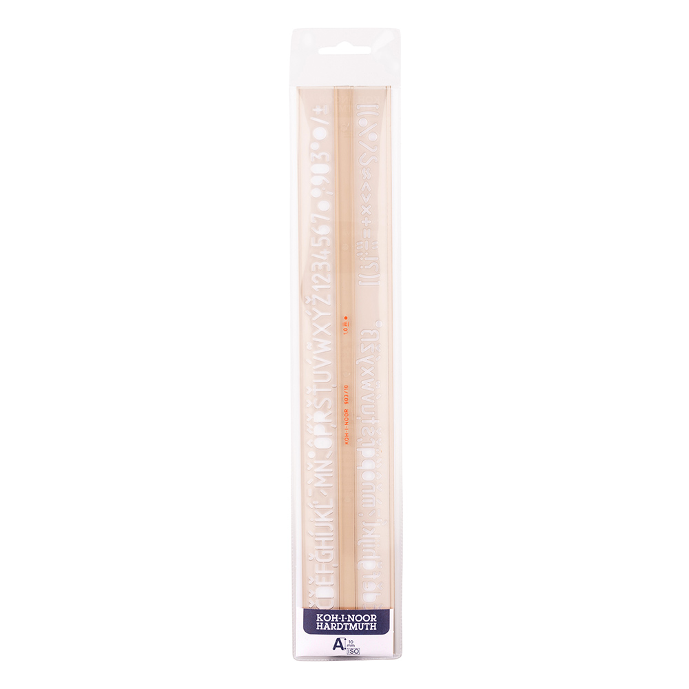 Písmenková šablona vyrobená z kouřového průhledného polystyrenu. Je určena pro práci s technickým perem 1,0 mm. Obsahuje znaky velké a malé abecedy, číslic a matematických znaků. Veškeré znaky jsou velikosti 10 mm a tvaru ISO. Šablona je určena k popisování ve škole i v kanceláři. Zabalena je do celotransparentního polypropylenového pouzdra s papírovou vložkou a eurozávěsem.