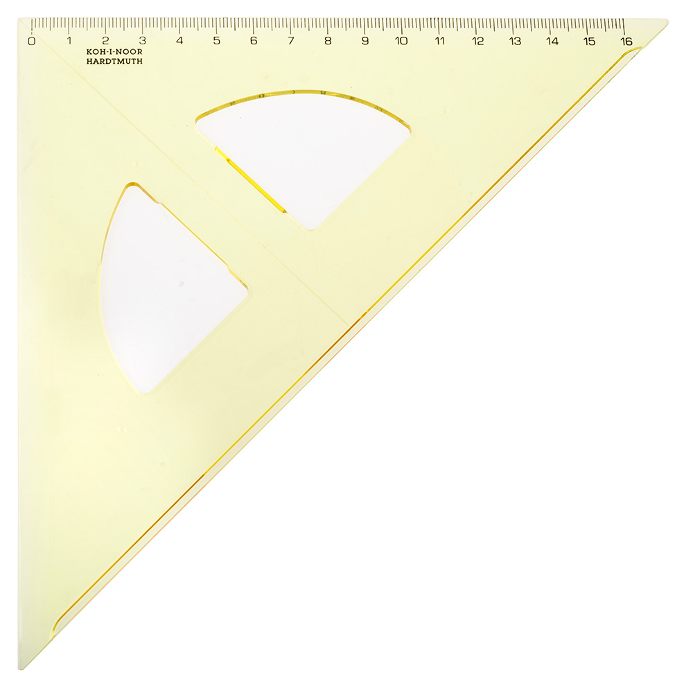 Trojúhelník 45/177 s kolmicí vyrobený ze žlutého průhledného polystyrenu. Stupnice je naražena technologií horké ražby. Přesnost stupnice 0,2% délky. Mimo délkové stupnice je vybaven i ryskou pro konstruování kolmic. Trojúhelník je určený k rýsování a technickému kreslení ve škole i v kanceláři. Zabalen je do potištěného polypropylenového sáčku s eurozávěsem.