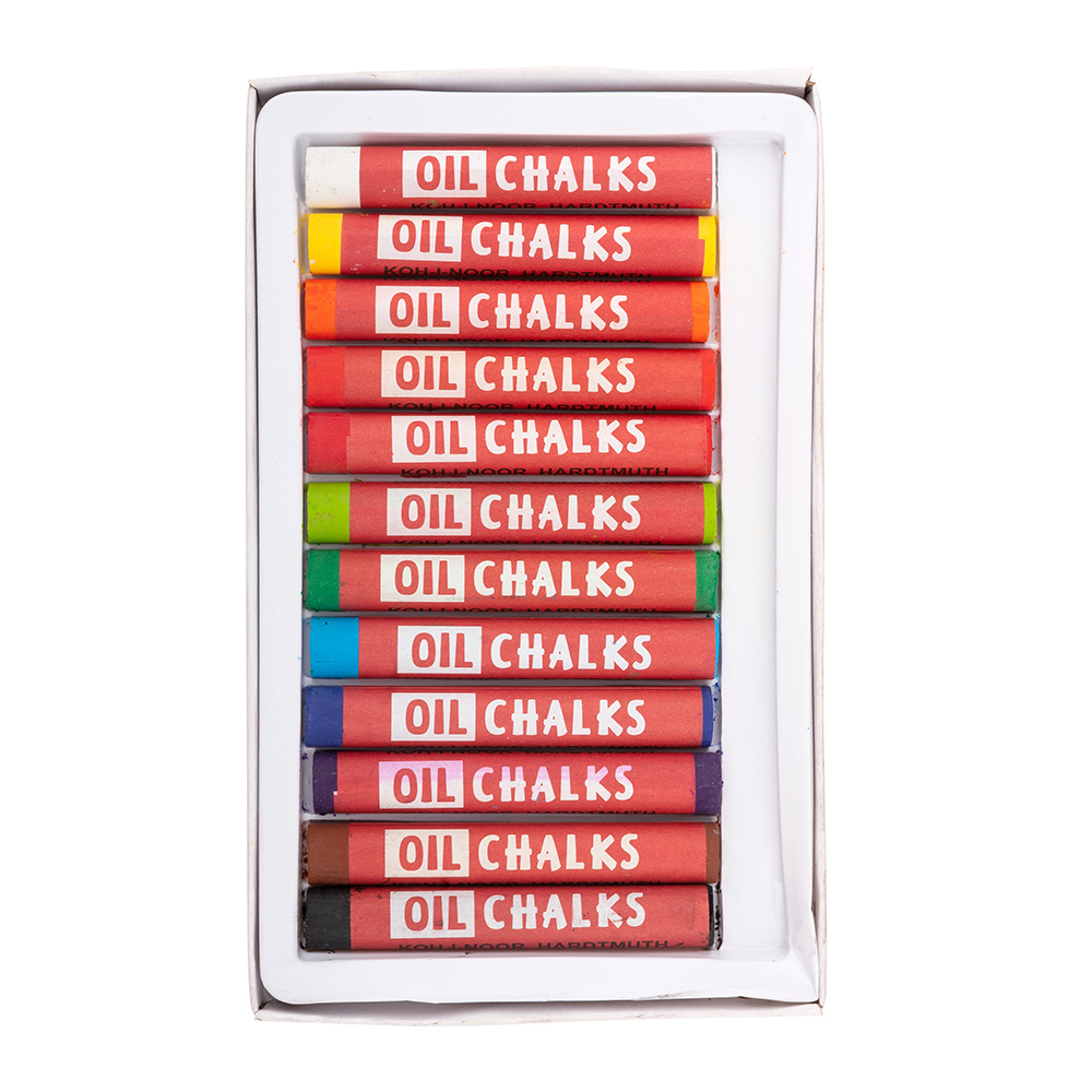 Souprava olejových kříd určených pro školní účely, pro aranžérské a umělecké kreslení. Souprava 12 kusů olejových kříd o rozměrech Ø cca 8,9 mm, délka 60 mm. Každá olejová křída je obalená zavinovacím štítkem červeno-bílým s černo – červeno – bílým textem KOH-I-NOOR HARDTMUTH OIL CHALKS. Olejové křídy jsou vložené do kartonové potištěné krabičky s eurozavěsem v 12 odstínech.