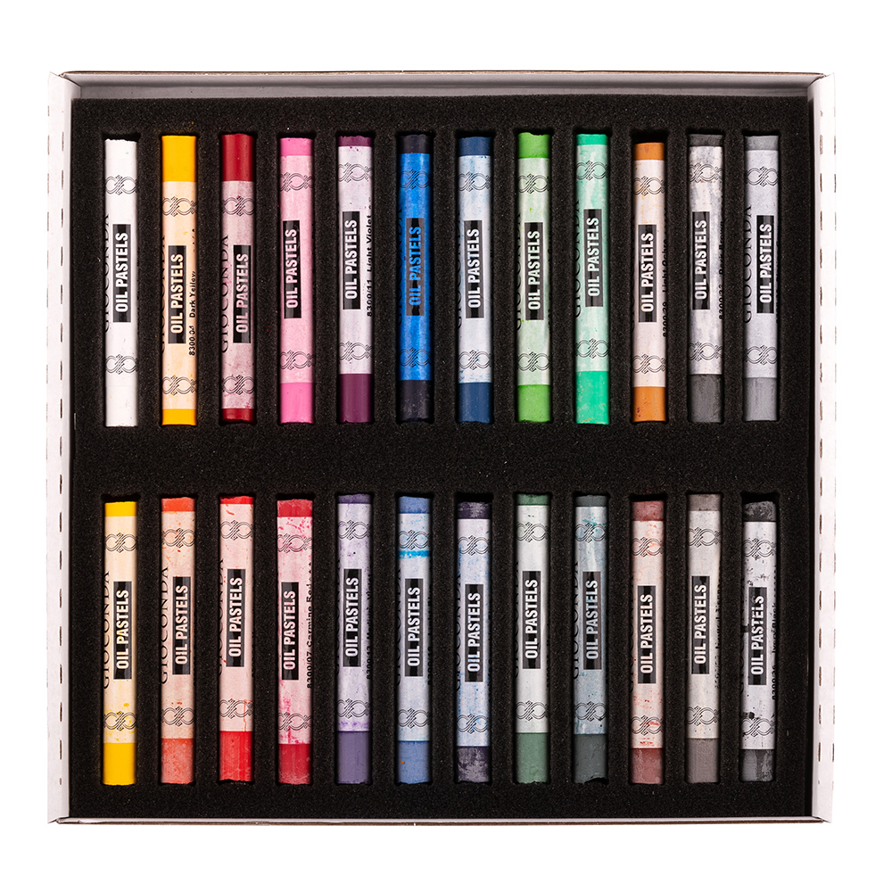 Souprava 24 ks barev olejových pastelů. Jsou určeny pro umělecké i hobby kreslení. Mají vynikající světlostálost i barevnou kryvost. Vyrábějí se v průměru 10 mm, délce 75 mm a povrch je chráněn ovinem.