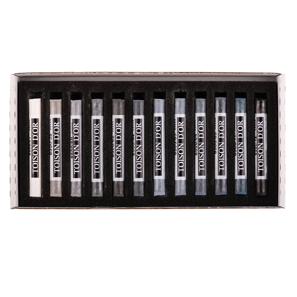 Speciální 12 ks souprava šedých pastelů s ovinem o průměru 10 mm a délce 75 mm. Jsou vhodné především pro černobílou kresbu. Při kreslení je možné použít držák pastelů KOH-I-NOOR Versatil. Kresbu doporučujeme po dokončení stabilizovat fixativem.