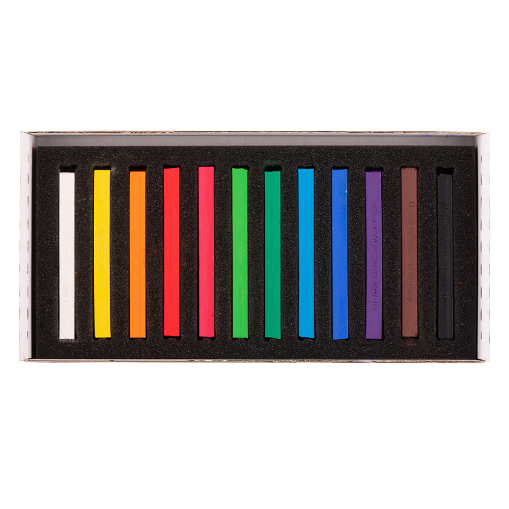 Souprava 12 ks prašných uměleckých pastelů s pevnější strukturou, čtvercového profilu 7 x 7 mm a délky 75 mm. Jsou používány pro tenčí a obrysové linie. Jako plnivo se používá mletá pemza.