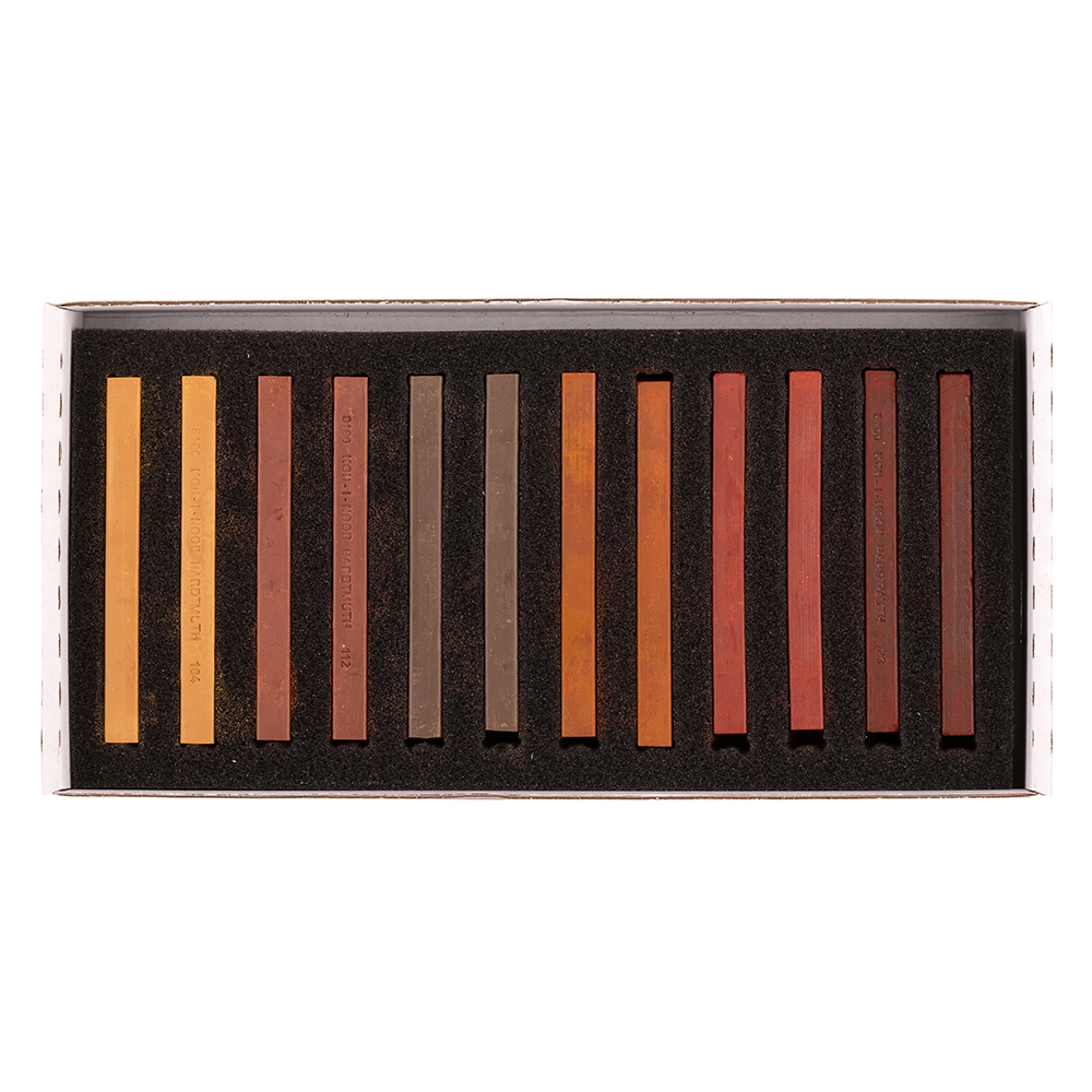 12 ks souprava uměleckých tvrdých hranatých pastelů o rozměru 7 x 7 x 75 mm – HNĚDÁ ŘADA - zabalené v kartonové krabičce s manžetou. Křídy jsou určeny pro umělecké a hobby kreslení. Silně pigmentované s vysokou světlostálostí a hladkou stopou.