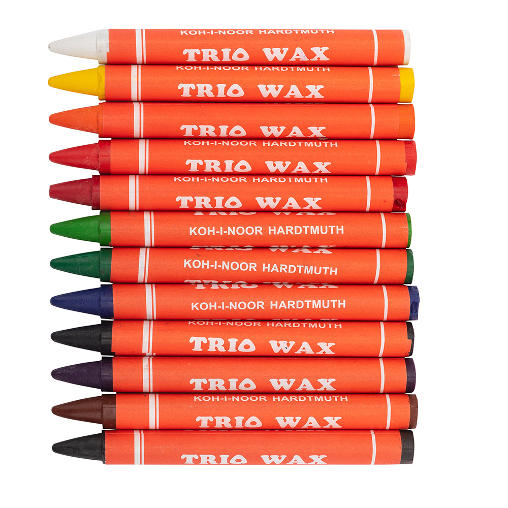 Souprava 12 kusů trojhranných voskovek se zašpičatělým koncem o rozměrech TR 8,2 mm, délka 90 mm. Každá voskovka je obalená červeným zavinovacím štítkem. Výrobek se používá jako souprava trojhranných voskovek určených pro školní, aranžérské a umělecké kreslení – 12 ks souprava. Voskovky jsou vložené hroty k eurozávěsu, do kartonové potištěné krabičky s motivem medvědi.