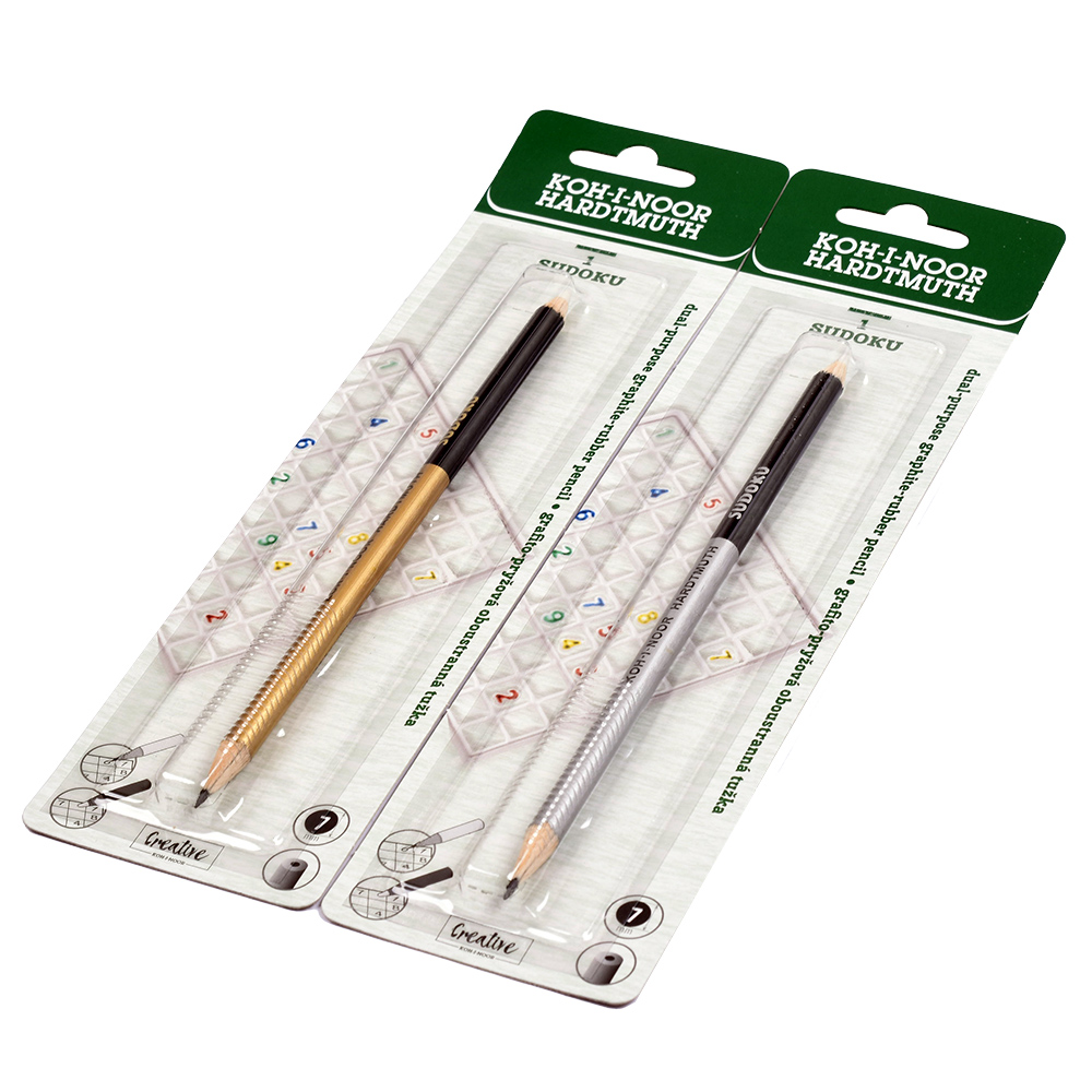 Oboustranné kulaté tužky v dřevěném plášti v kombinaci s grafitovým jádrem v gradaci 2B a pryžovým jádrem. Tužky jsou zabaleny po 1 ks do blistru buď zlatá nebo stříbrná. Jsou vhodné zvláště pro milovníky luštění křížovek a SUDOKU.