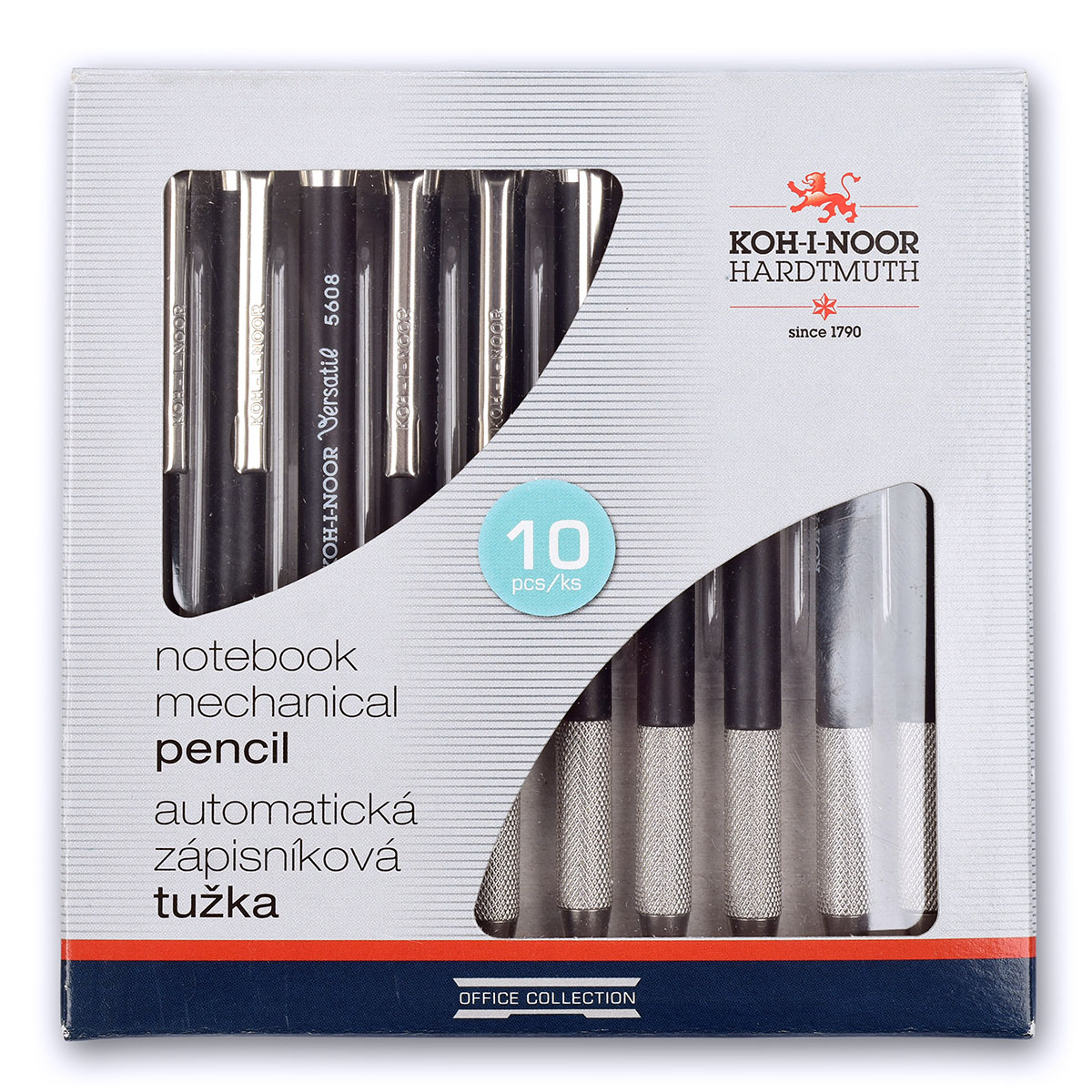 Tužka automatická zápisníková, kombinace kov-plast, je určena pro běžné psaní tuhou pr. 2 mm. Tuha se posunuje stisknutím knoflíku hrotítka v jakékoli poloze tužky, tím dojde k otevření kleštiny a vysunutí tuhy. V knoflíku je umístěno hrotítko, po odšroubování knoflíku lze hrotit tuhu. Plášť tužky je kovový kruhového profilu stříkaný černou barvou, díly mechaniky kovové niklované, stiskací trubka plastová. Tužka má kovový klip. Balení je skupinové, 10 ks je vloženo do tvarové vložky a vsunuto do papírové krabičky s potiskem ve školním designu.