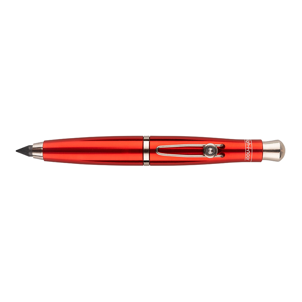 Tužka mechanická padací, kovová, pro běžné psaní a kreslení s tuhou pr. 5,6 mm. Tuha se posunuje stisknutím knoflíku v nakloněné poloze, tím dojde k otevření kleštiny a vysunutí tuhy dle potřeby. Tuhu lze hrotit, musí se odšroubovat knoflík, v něm umístěno hrotítko. Plášť ma kruhový profil se 4 podélnými drážkami v červeném eloxu, díly jsou niklované, klip drátový. Tužka je vložena do tvarové vložky a zasunuta do transparentního PET pouzdra.