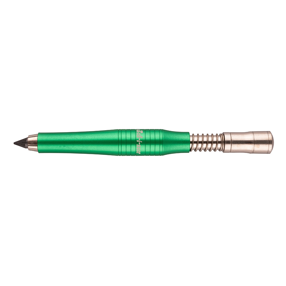 Tužka mechanická padací, bez klipu, s tuhou o průměru 5,6 mm je určená pro běžné psaní a kreslení. Plášť tužky je kovový (hliníková slitina) kruhového tvarového profilu s drážkami, zeleně eloxovaný. Mezi hrotítkem a pláštěm je spojka hrotítka, na které je navlečena viditelná pružina. Tuha se posunuje stisknutím knoflíku hrotítka v nakloněné poloze tužky, tím dojde ke stlačení pružiny a otevření kleštiny a libovolnému vysunutí tuhy. V knoflíku je umístěno hrotítko, po odšroubování knoflíku lze hrotit tuhu. Grafitovou tuhu lze nahradit tuhami pastelovými. Mechanická tužka je uložena do dřevěného stojánku (překližka) a vložená do plastového transparentního PET obalu s eurozávěsem. Stojánek lze po vysunutí z PET obalu použít k odkládání tužky na stole. Logo Koh-i-noor je gravírované laserem na válcové části pláště a na vrchní straně stojánku.