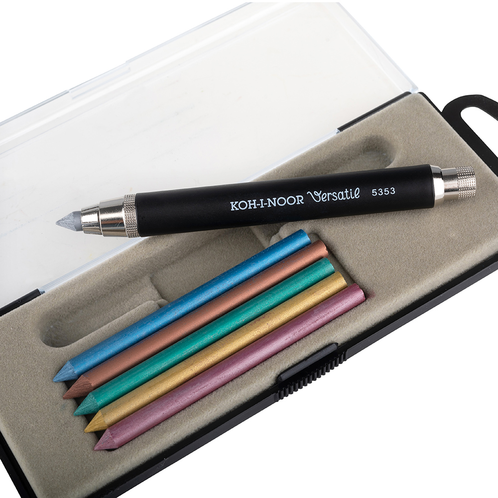 Souprava mechanické padací tužky, kovové, s povrchem se soft efektem a stříbrnou tuhou pr. 5,6 mm a sady 5 barevných tuh. Souprava je určená pro běžné psaní i kreslení. Tuha v tužce se posunuje stisknutím knoflíku v nakloněné poloze tužky, tím dojde k otevření kleštiny a vysunutí tuhy. V knoflíku je umístěno hrotítko, po odšroubování knoflíku lze hrotit tuhu. Plášť tužky černé barvy je kruhového profilu pr. 12, mm. Tužka vzhledově vypadá jako pogumovaná, nemá klip. Tužka je vložena do tvarové vložky, vedle tužky je 5 tuh pr. 5,6 mm v barvě metalízy bronzové, modré, zelené, zlaté a růžové, vše je v plastovém pouzdru s transparentním víkem.