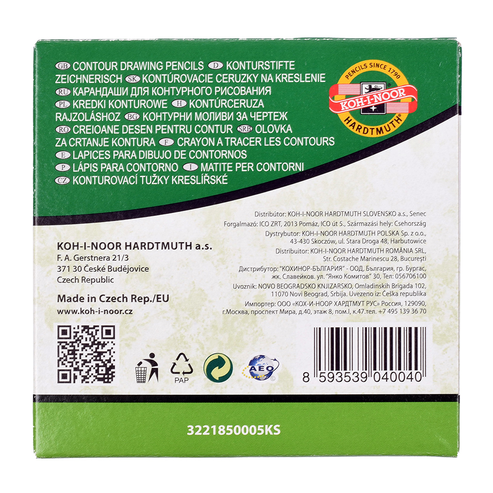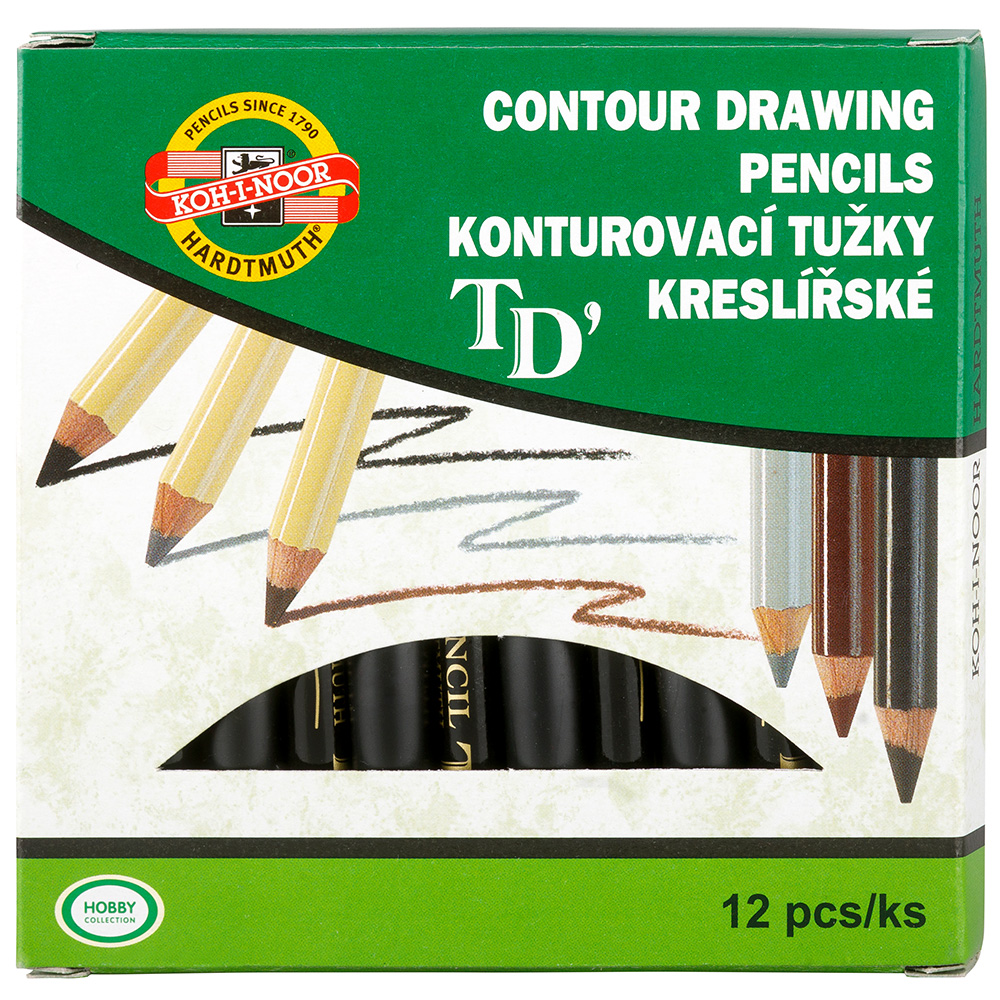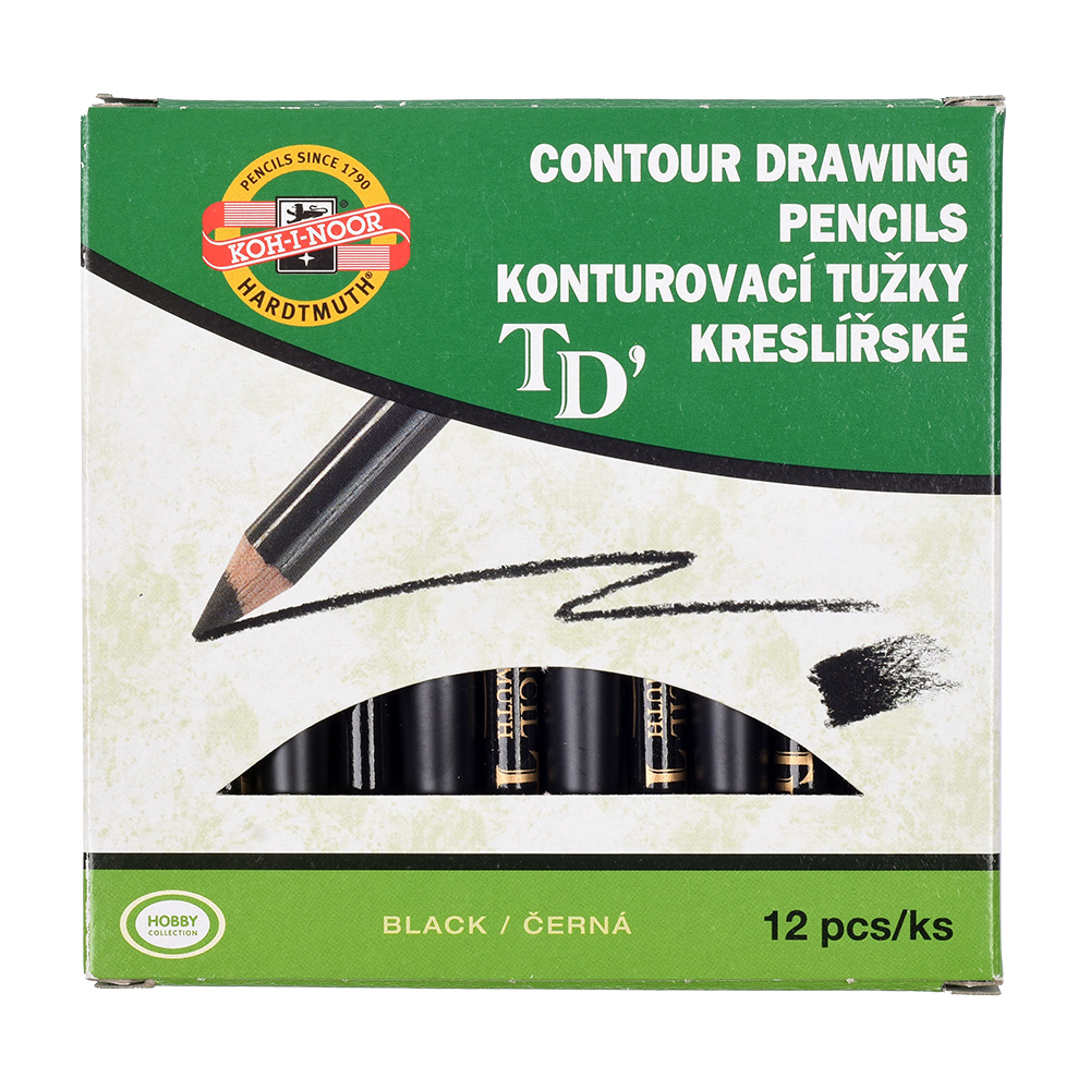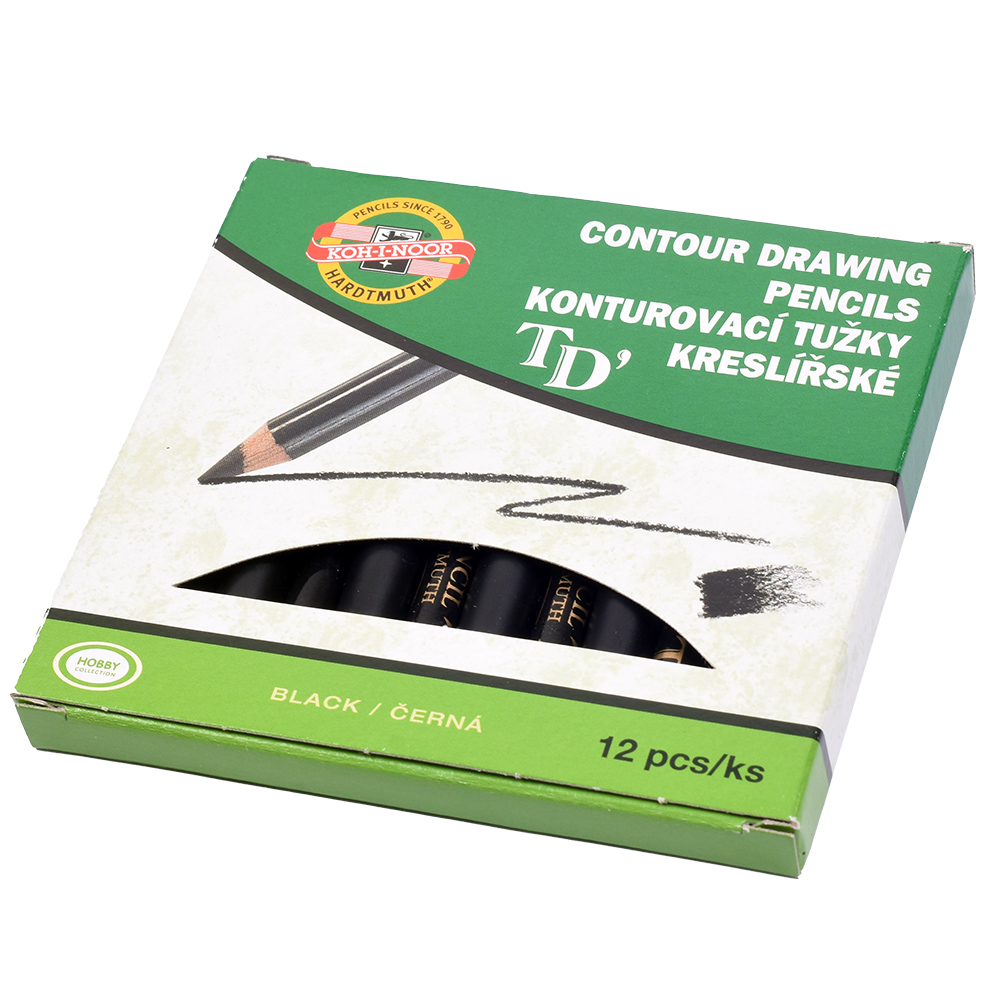 Kulaté konturovací tužky kreslířské, průměr - 7,5 mm, v dřevěném plášti, jádro v barvě černé. Balené po 12 ks jedné barvy s chránítkem hrotu do kartonové krabičky. Jsou vhodné pro zvýraznění kontur.