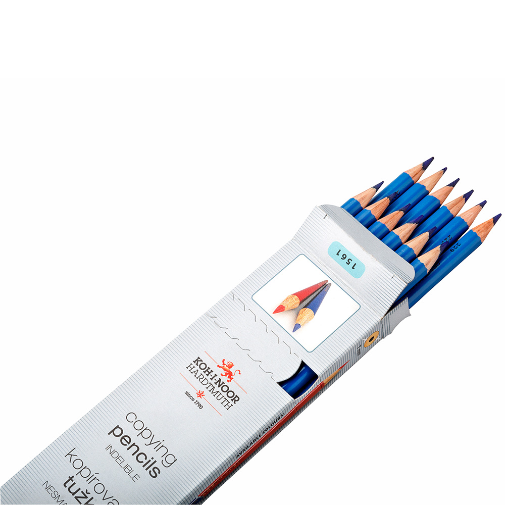 Sada modrých kopírovacích tužek 1561 - 12 ks tužek v kartonové krabičce. Kulaté tužky v dřevěném plášti Ø - 7 mm. Tužky mají výraznou barevnou stopu, obtížně odstranitelnou. Je vhodná i pro speciální grafické techniky.