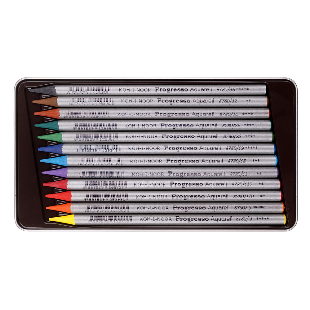 Souprava 12 ks akvarelových pastelových tužek v laku a balené v plechovém obalu. Výrobek je další řadou v oblíbené sérii PROGRESSO. Pastelové tužky v laku PROGRESSO Aquarell jsou bez dřevěného pláště. Oproti standardnímu výrobku je navíc možno kresbu rozmývat vodou. Je ho tedy možné použít i k akvarelové malbě a vhodný je pro hobby i umělecké kreslení.