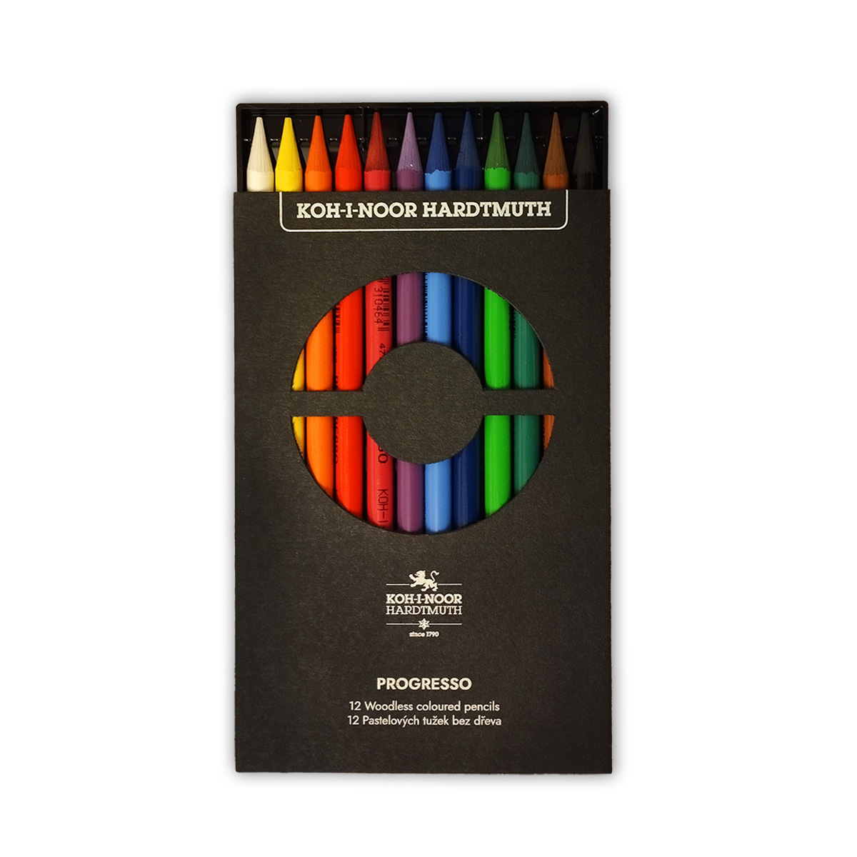 Souprava 12 ks pastelových tužek v laku (PROGRESSO). Jsou bez dřevěného pláště a celý průřez je tvořen pastelovým jádrem. Pastelky se velice dobře hrotí a jsou určeny pro školní, hobby i umělecké kreslení. Vzhledem k svému průřezu jsou vhodné především pro vybarvování velkých ploch.