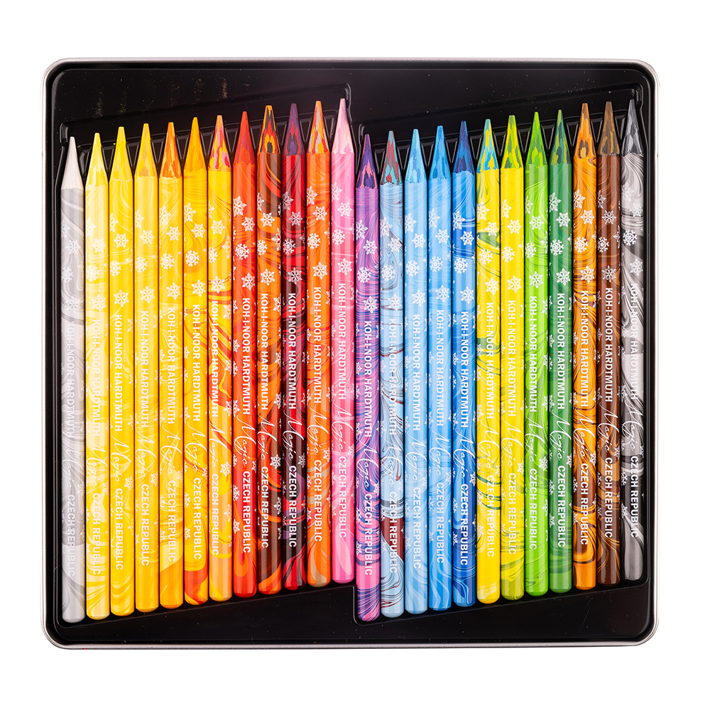 Kulaté pastelové tužky v laku MAGIC se speciálním tříbarevným jádrem – 3 odstíny barvy v jedné tuze. Tužka vytváří vícebarevnou stopu, která se mění natočením hrotu. Jedinečná pro vybarvení větších ploch, na které se má střídat více blízkých odstínů např. tráva, moře atd. Pro dosažení barevného efektu za použití různých technik kreseb /stínování, šrafování/ je výsledný efekt kresby plastičtější než u kresby klasickou pastelkou. K dotvoření přirozeného efektu hotové kresby se použije Blender s nepigmentovaným jádrem, které lze použít na barevnou kresbu či plochu ke smíchání jednotlivých stop odstínů a výsledná kresba dosáhne komplexního a homogenního vzhledu.